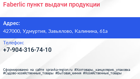 Faberlic, пункт выдачи продукции по адресу 427000, Удмуртия, Завьялово, Калинина, 61а в дальнейшем Организация, размещена в следующих категориях: