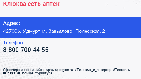 Клюква, сеть аптек по адресу 427006, Удмуртия, Завьялово, Полесская, 2 в дальнейшем Организация, размещена в следующих категориях: