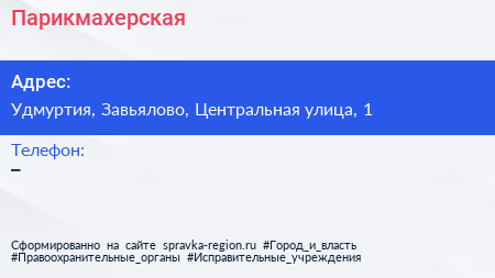 Парикмахерская по адресу Удмуртия, Завьялово, Центральная улица, 1 в дальнейшем Организация, размещена в следующих категориях: