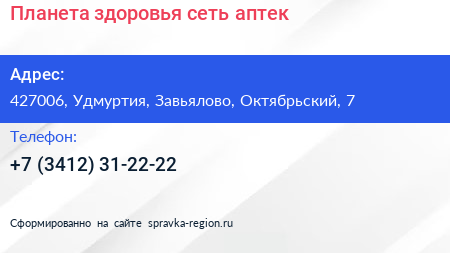 Планета здоровья, сеть аптек по адресу 427006, Удмуртия, Завьялово, Октябрьский, 7 в дальнейшем Организация, размещена в следующих категориях: