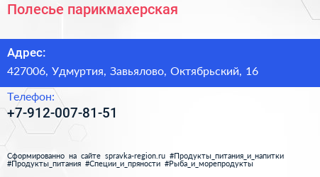 Полесье, парикмахерская по адресу 427006, Удмуртия, Завьялово, Октябрьский, 16 в дальнейшем Организация, размещена в следующих категориях: