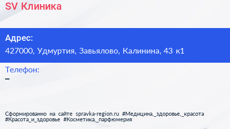 SV Клиника по адресу 427000, Удмуртия, Завьялово, Калинина, 43 к1 в дальнейшем Организация, размещена в следующих категориях: