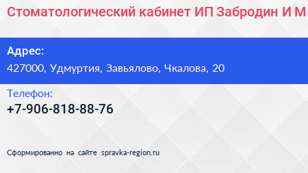 Стоматологический кабинет, ИП Забродин И.М. по адресу 427000, Удмуртия, Завьялово, Чкалова, 20 в дальнейшем Организация, размещена в следующих категориях: