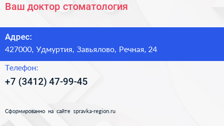 Ваш доктор, стоматология по адресу 427000, Удмуртия, Завьялово, Речная, 24 в дальнейшем Организация, размещена в следующих категориях: