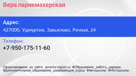 Вера, парикмахерская по адресу 427000, Удмуртия, Завьялово, Речная, 24 в дальнейшем Организация, размещена в следующих категориях:
