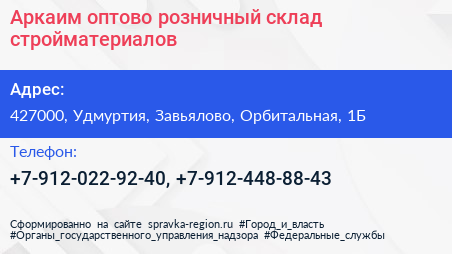 Аркаим, оптово-розничный склад стройматериалов по адресу 427000, Удмуртия, Завьялово, Орбитальная, 1Б в дальнейшем Организация, размещена в следующих категориях: