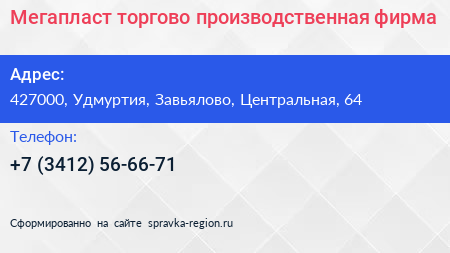 Мегапласт, торгово-производственная фирма по адресу 427000, Удмуртия, Завьялово, Центральная, 64 в дальнейшем Организация, размещена в следующих категориях: