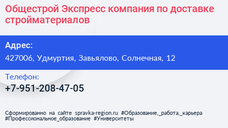Общестрой-Экспресс, компания по доставке стройматериалов по адресу 427006, Удмуртия, Завьялово, Солнечная, 12 в дальнейшем Организация, размещена в следующих категориях: