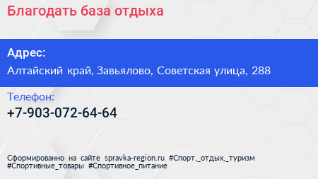 Благодать, база отдыха по адресу Алтайский край, Завьялово, Советская улица, 288 в дальнейшем Организация, размещена в следующих категориях: