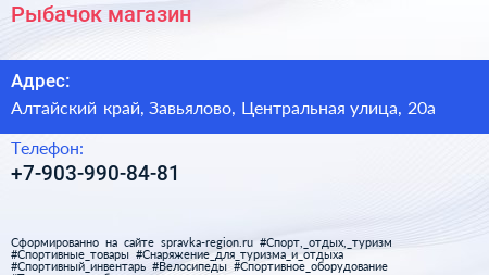 Рыбачок, магазин по адресу Алтайский край, Завьялово, Центральная улица, 20а в дальнейшем Организация, размещена в следующих категориях: