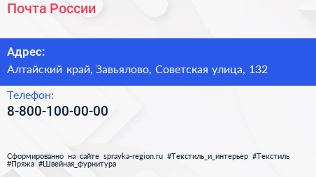 Почта России по адресу Алтайский край, Завьялово, Советская улица, 132 в дальнейшем Организация, размещена в следующих категориях: