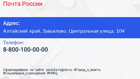 Почта России по адресу Алтайский край, Завьялово, Центральная улица, 104 в дальнейшем Организация, размещена в следующих категориях:
