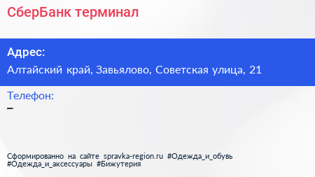 СберБанк, терминал по адресу Алтайский край, Завьялово, Советская улица, 21 в дальнейшем Организация, размещена в следующих категориях: