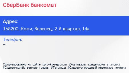СберБанк, банкомат по адресу 168200, Коми, Зеленец, 2-й квартал, 14а в дальнейшем Организация, размещена в следующих категориях: