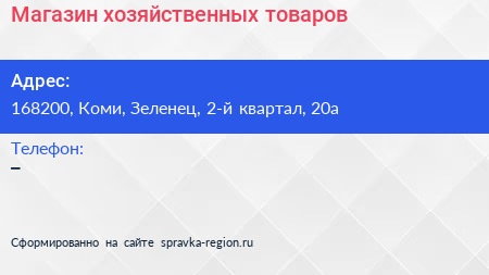 Магазин хозяйственных товаров по адресу 168200, Коми, Зеленец, 2-й квартал, 20а в дальнейшем Организация, размещена в следующих категориях: