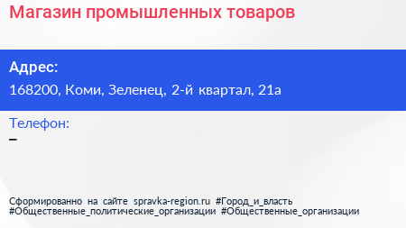 Магазин промышленных товаров по адресу 168200, Коми, Зеленец, 2-й квартал, 21а в дальнейшем Организация, размещена в следующих категориях: