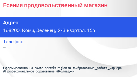Есения, продовольственный магазин по адресу 168200, Коми, Зеленец, 2-й квартал, 15а в дальнейшем Организация, размещена в следующих категориях: