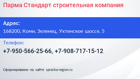 Парма Стандарт, строительная компания по адресу 168200, Коми, Зеленец, Ухтинское шоссе, 5 в дальнейшем Организация, размещена в следующих категориях: