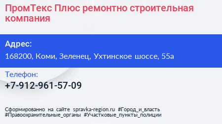 ПромТекс Плюс, ремонтно-строительная компания по адресу 168200, Коми, Зеленец, Ухтинское шоссе, 55а в дальнейшем Организация, размещена в следующих категориях:
