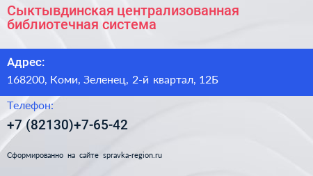 Сыктывдинская централизованная библиотечная система по адресу 168200, Коми, Зеленец, 2-й квартал, 12Б в дальнейшем Организация, размещена в следующих категориях: