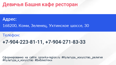 Девичья Башня, кафе-ресторан по адресу 168200, Коми, Зеленец, Ухтинское шоссе, 30 в дальнейшем Организация, размещена в следующих категориях: