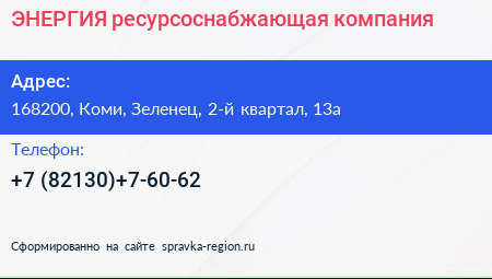 ЭНЕРГИЯ, ресурсоснабжающая компания по адресу 168200, Коми, Зеленец, 2-й квартал, 13а в дальнейшем Организация, размещена в следующих категориях: