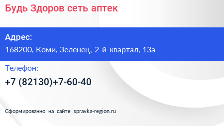 Будь Здоров, сеть аптек по адресу 168200, Коми, Зеленец, 2-й квартал, 13а в дальнейшем Организация, размещена в следующих категориях: