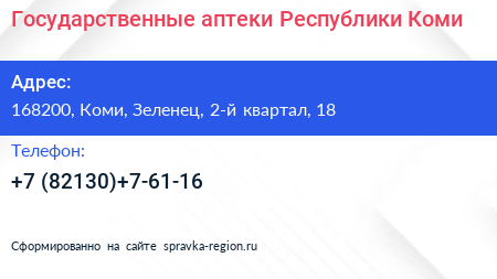 Государственные аптеки Республики Коми по адресу 168200, Коми, Зеленец, 2-й квартал, 18 в дальнейшем Организация, размещена в следующих категориях: