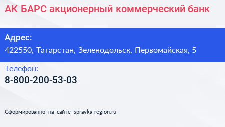 АК БАРС, акционерный коммерческий банк по адресу 422550, Татарстан, Зеленодольск, Первомайская, 5 в дальнейшем Организация, размещена в следующих категориях: