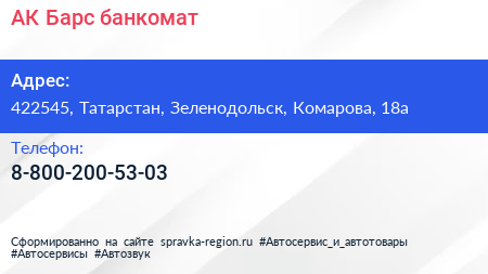 АК Барс, банкомат по адресу 422545, Татарстан, Зеленодольск, Комарова, 18а в дальнейшем Организация, размещена в следующих категориях: