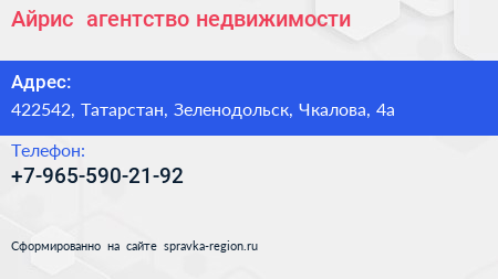 Айрис+, агентство недвижимости по адресу 422542, Татарстан, Зеленодольск, Чкалова, 4а в дальнейшем Организация, размещена в следующих категориях: