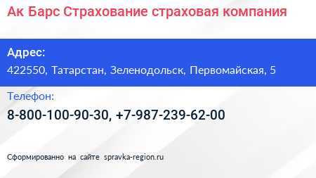 Ак Барс Страхование, страховая компания по адресу 422550, Татарстан, Зеленодольск, Первомайская, 5 в дальнейшем Организация, размещена в следующих категориях: