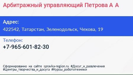 Арбитражный управляющий Петрова А.А. по адресу 422542, Татарстан, Зеленодольск, Чехова, 19 в дальнейшем Организация, размещена в следующих категориях: