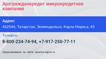 Архгражданкредит, микрокредитная компания по адресу 422544, Татарстан, Зеленодольск, Карла Маркса, 43 в дальнейшем Организация, размещена в следующих категориях: