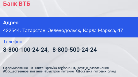 Банк ВТБ по адресу 422544, Татарстан, Зеленодольск, Карла Маркса, 47 в дальнейшем Организация, размещена в следующих категориях:
