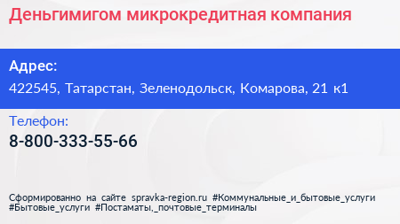 Деньгимигом, микрокредитная компания по адресу 422545, Татарстан, Зеленодольск, Комарова, 21 к1 в дальнейшем Организация, размещена в следующих категориях: