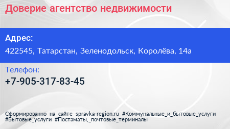 Доверие, агентство недвижимости по адресу 422545, Татарстан, Зеленодольск, Королёва, 14а в дальнейшем Организация, размещена в следующих категориях: