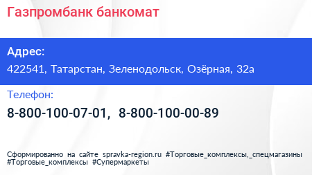 Газпромбанк, банкомат по адресу 422541, Татарстан, Зеленодольск, Озёрная, 32а в дальнейшем Организация, размещена в следующих категориях:
