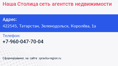 Наша Столица, сеть агентств недвижимости по адресу 422545, Татарстан, Зеленодольск, Королёва, 1а в дальнейшем Организация, размещена в следующих категориях: