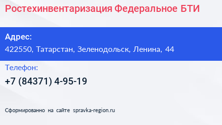 Ростехинвентаризация-Федеральное БТИ по адресу 422550, Татарстан, Зеленодольск, Ленина, 44 в дальнейшем Организация, размещена в следующих категориях: