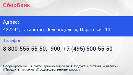 СберБанк по адресу 422544, Татарстан, Зеленодольск, Паратская, 13 в дальнейшем Организация, размещена в следующих категориях: