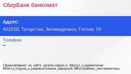 СберБанк, банкомат по адресу 422550, Татарстан, Зеленодольск, Гоголя, 50 в дальнейшем Организация, размещена в следующих категориях: