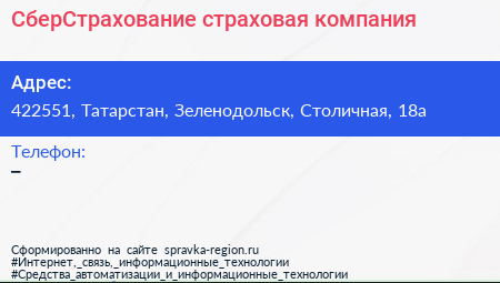 СберСтрахование, страховая компания по адресу 422551, Татарстан, Зеленодольск, Столичная, 18а в дальнейшем Организация, размещена в следующих категориях: