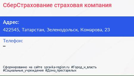 СберСтрахование, страховая компания по адресу 422545, Татарстан, Зеленодольск, Комарова, 23 в дальнейшем Организация, размещена в следующих категориях: