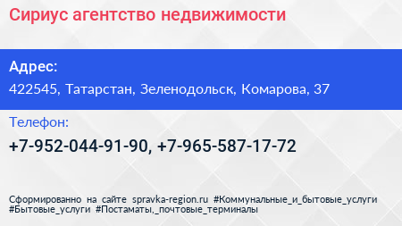 Сириус, агентство недвижимости по адресу 422545, Татарстан, Зеленодольск, Комарова, 37 в дальнейшем Организация, размещена в следующих категориях: