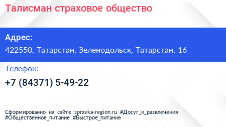 Талисман, страховое общество по адресу 422550, Татарстан, Зеленодольск, Татарстан, 16 в дальнейшем Организация, размещена в следующих категориях: