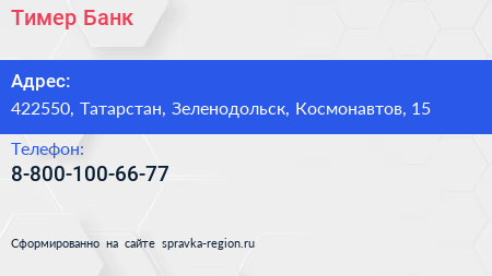 Тимер Банк по адресу 422550, Татарстан, Зеленодольск, Космонавтов, 15 в дальнейшем Организация, размещена в следующих категориях: