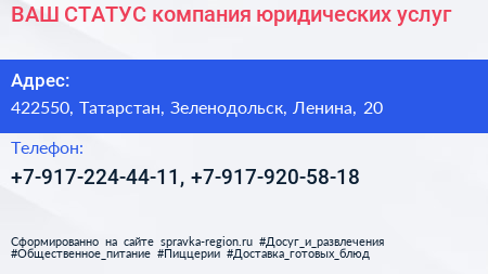 ВАШ СТАТУС, компания юридических услуг по адресу 422550, Татарстан, Зеленодольск, Ленина, 20 в дальнейшем Организация, размещена в следующих категориях: