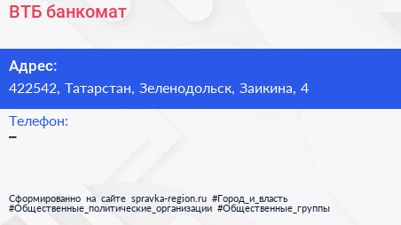 ВТБ, банкомат по адресу 422542, Татарстан, Зеленодольск, Заикина, 4 в дальнейшем Организация, размещена в следующих категориях: