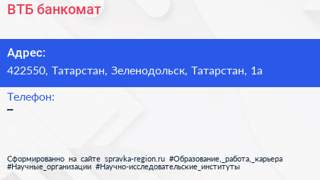 ВТБ, банкомат по адресу 422550, Татарстан, Зеленодольск, Татарстан, 1а в дальнейшем Организация, размещена в следующих категориях: